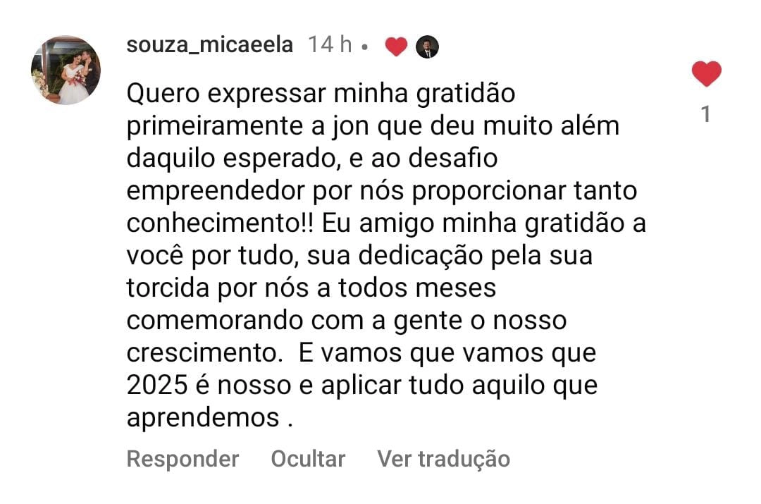 O Desafio vai além da gestão de negócios; ele transforma vidas, famílias e mentalidades. Muitos participantes relatam não apenas crescimento profissional, mas também superação de desafios emocionais, reconstrução familiar e até mesmo recuperação da saúde mental.